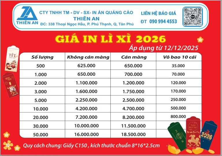 Xưởng In Thiên An kính gửi quý khách hàng bảng báo giá chi tiết in lịch tết 2026 ! Nếu quý khách cần thêm thông tin , đừng ngại nhắn tin cho XƯỞNG IN THIÊN AN , chúng tôi sẽ báo giá trong vòng 30 phút sau khi nhận được thông tin !